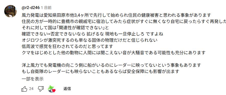過剰な山林伐採もさることながら、風車から発せられる音、周波数で熊が怯え、ますます生息域が追いやられているのではないかと懸念する意見に、「あー(言われてみたら…)」と思いました